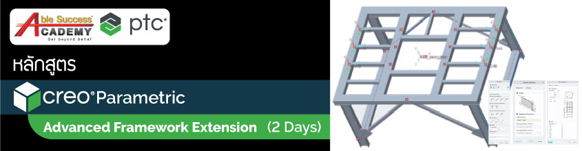 หลักสูตร “Creo Advanced Framework Extension” หลักสูตรนี้มุ่งเน้นการใช้งาน Creo เพื่อยกระดับการออกแบบโครงสร้างเหล็กและอลูมิเนียมโปรไฟล์ให้รวดเร็วกว่าการใช้ CAD ทั่วไป ผู้เรียนจะได้เรียนรู้ กระบวนการออกแบบแบบ Top-Down Design เริ่มตั้งแต่การวางโครงสร้างเส้นร่าง Skeleton การเรียกใช้ชิ้นงานจาก Library มาตรฐานที่มีให้เลือกมากมาย เช่น เหล็กรูปพรรณ, อลูมิเนียม, บันได และราวกันตก ไปจนถึงการใส่จุดต่อ Joints และ Bolt ต่างๆ อย่างอัตโนมัติ ผู้เข้าร่วมจะได้เรียนรู้ผ่านการทำเวิร์กช็อปและสอดแทรกเนื้อหาหรือทฤษฎีที่เกี่ยวข้องจะทำให้ผู้อบรมสามารถจะนำความรู้ไปประยุกต์ใช้กับงานที่ทำอยู่จริงได้อย่างถูกต้อง